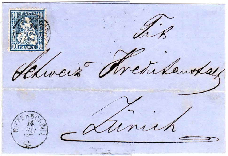 Schweiz 1866, kl. K1 RIFFERSCHWIL auf kl. Brief m. 10 C.