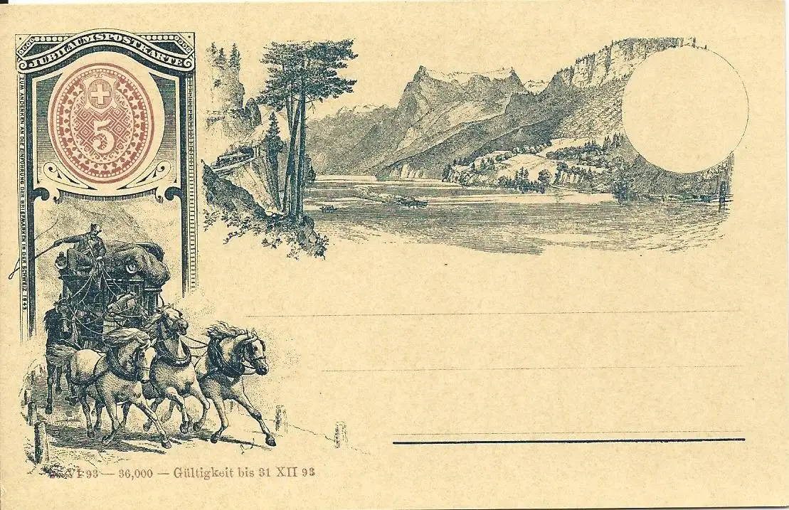 Schweiz 1893, ungebr. 5 C. Jubiläums Bild Ganzsache m. Pferde Post Kutsche