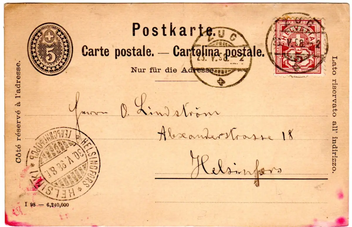 Schweiz 1898, 5 C. Zusatzfrankatur auf 5 C. Ganzsache v. Zug n. Finnland