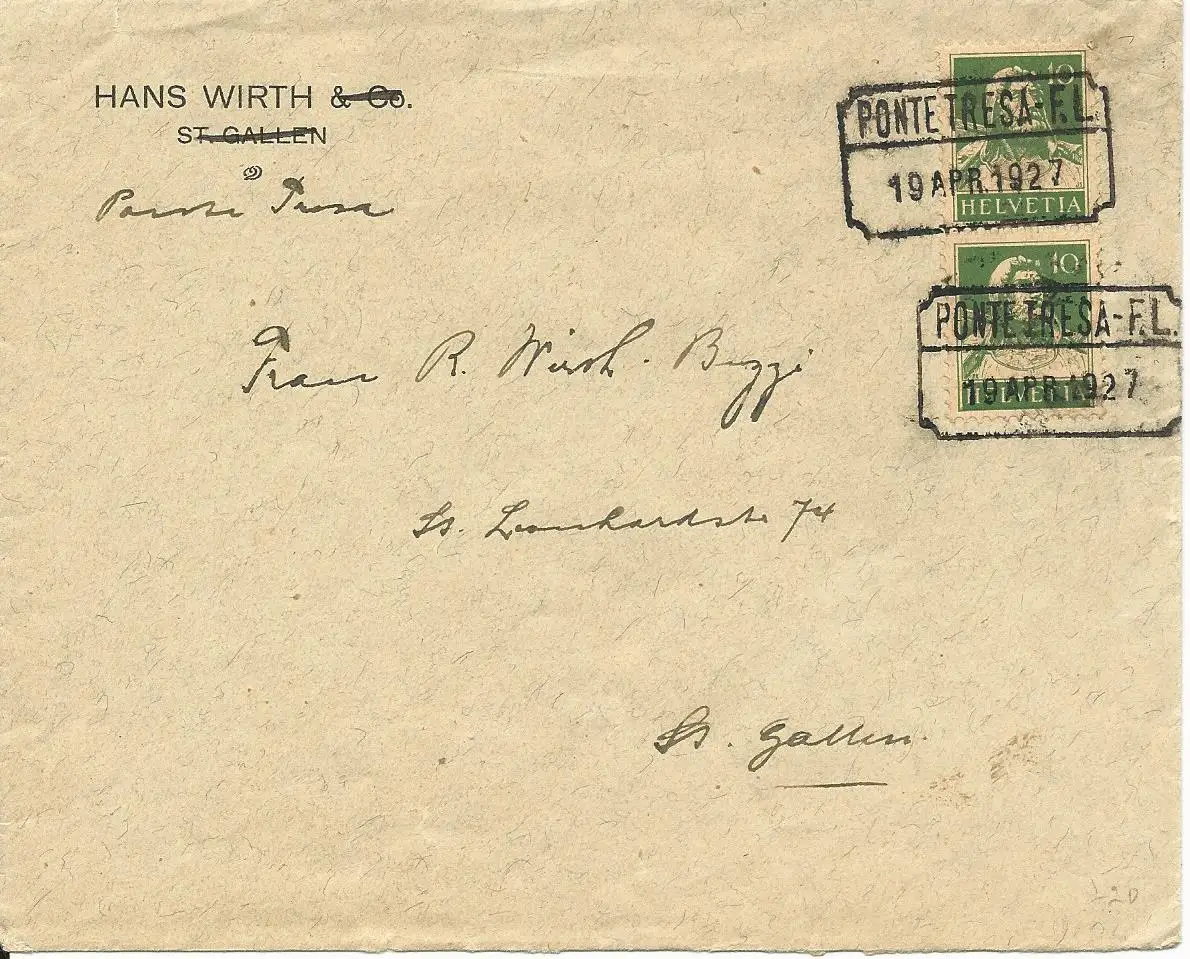 Schweiz 1927, PONTE TRESA F.L., bahnamtl. Stpl. auf Brief m. Paar 10 C.
