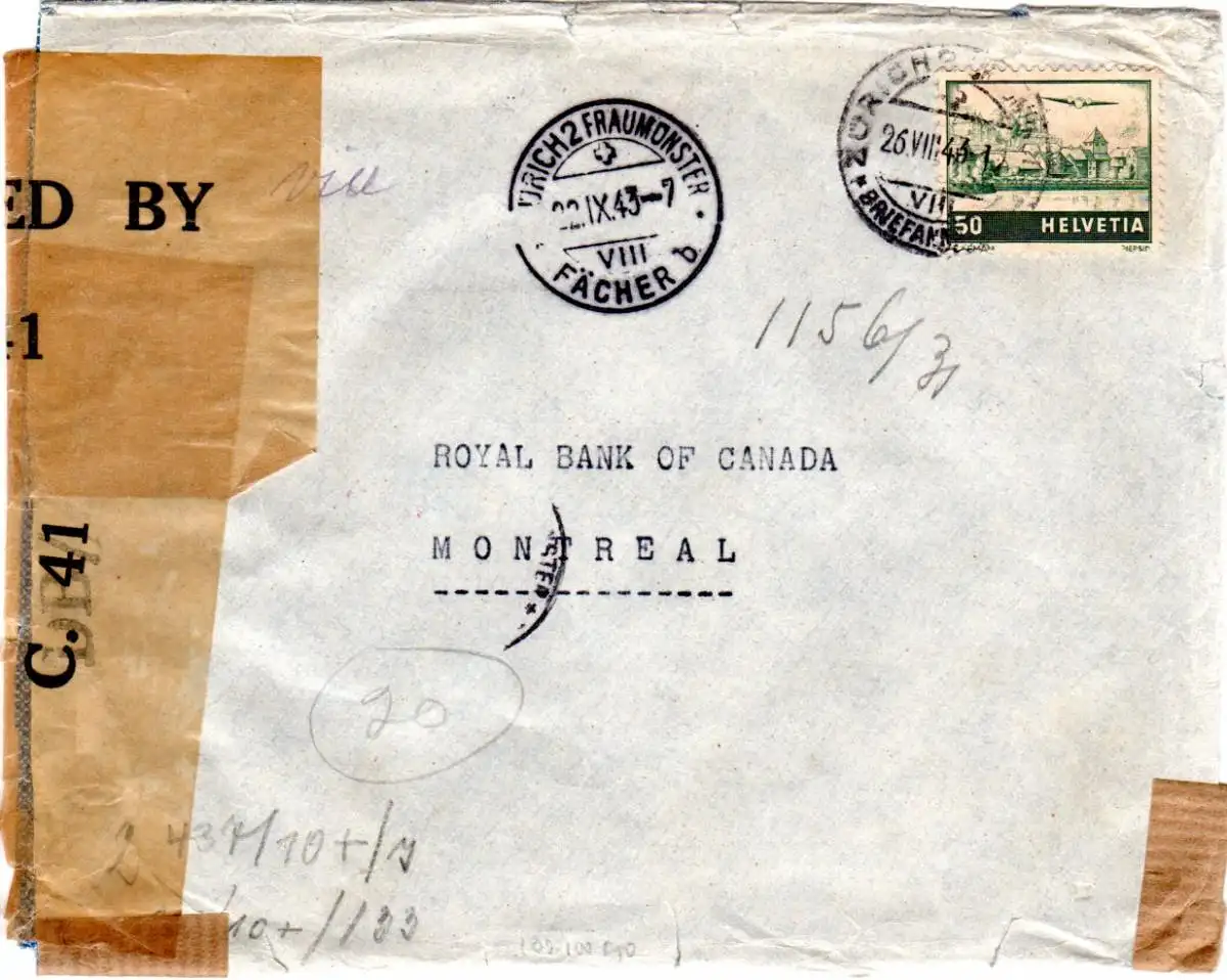 Schweiz 1943, 50 C. auf Zensur Brief v. Zürich Fraumünster n. Canda