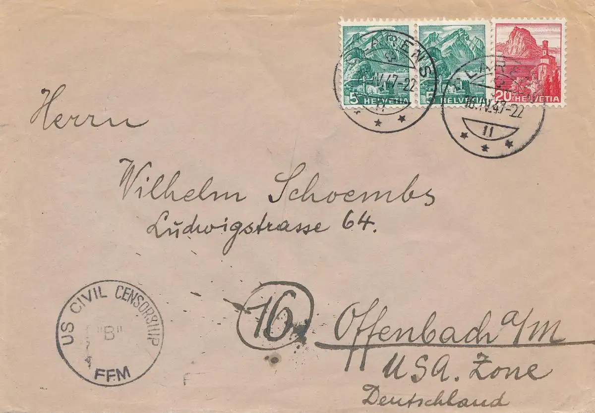 Schweiz: 1947 Clarens nach Offenbach, US Civil Censorship