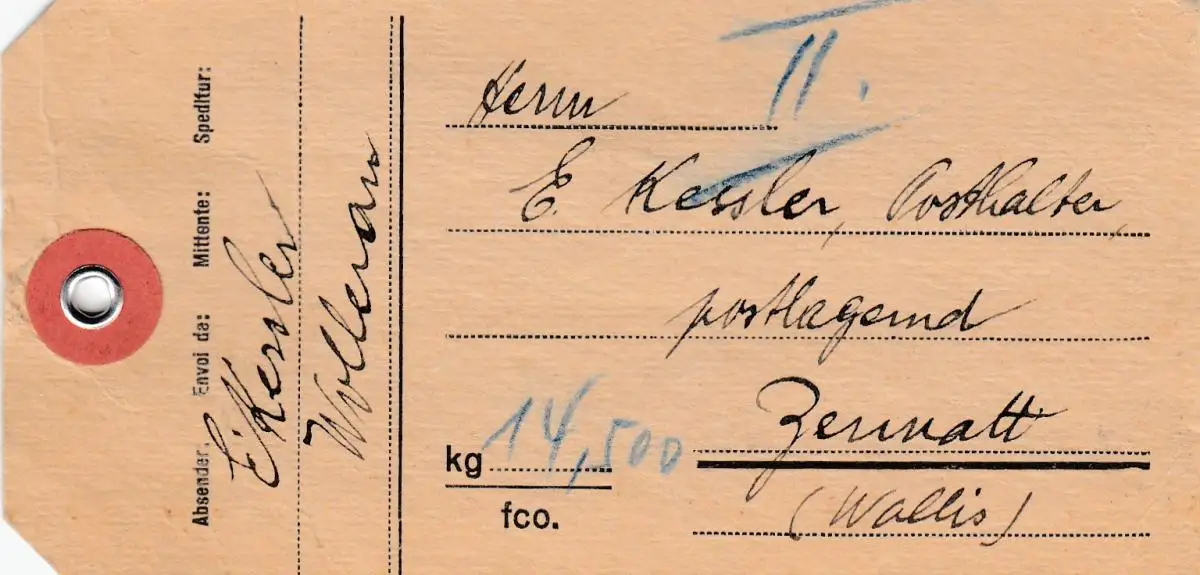 Schweiz: 1947 Paketanhänger Wollenau nach Zermatt