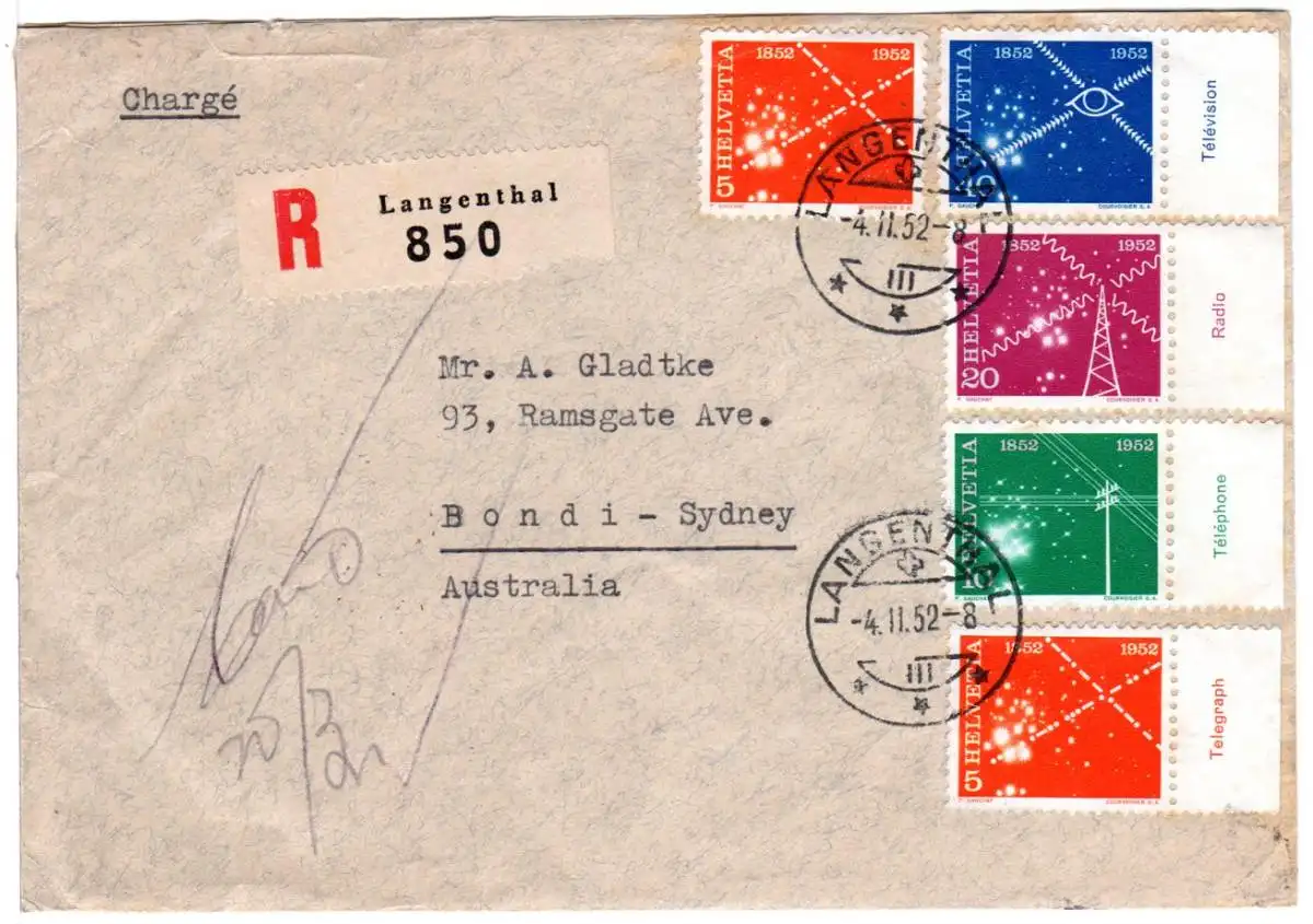 Schweiz 1952, 5 Werte Nachrichtenwesen auf R-Brief v. Langenthal n. Australien