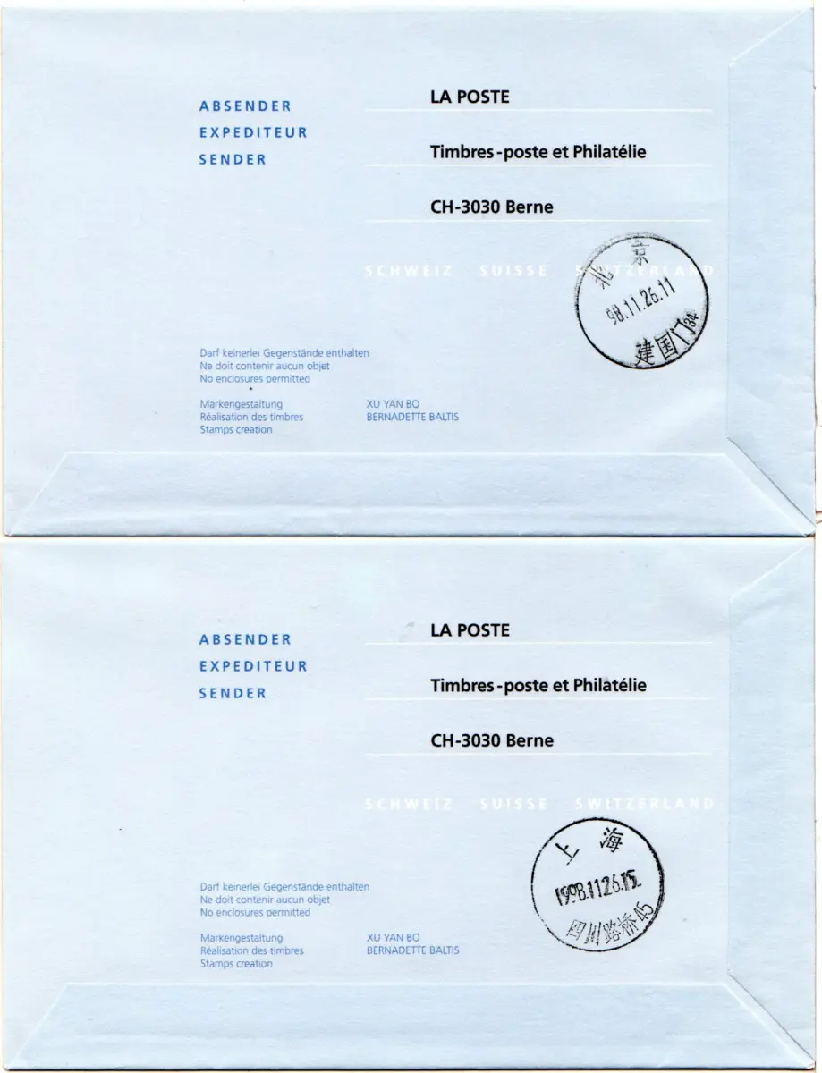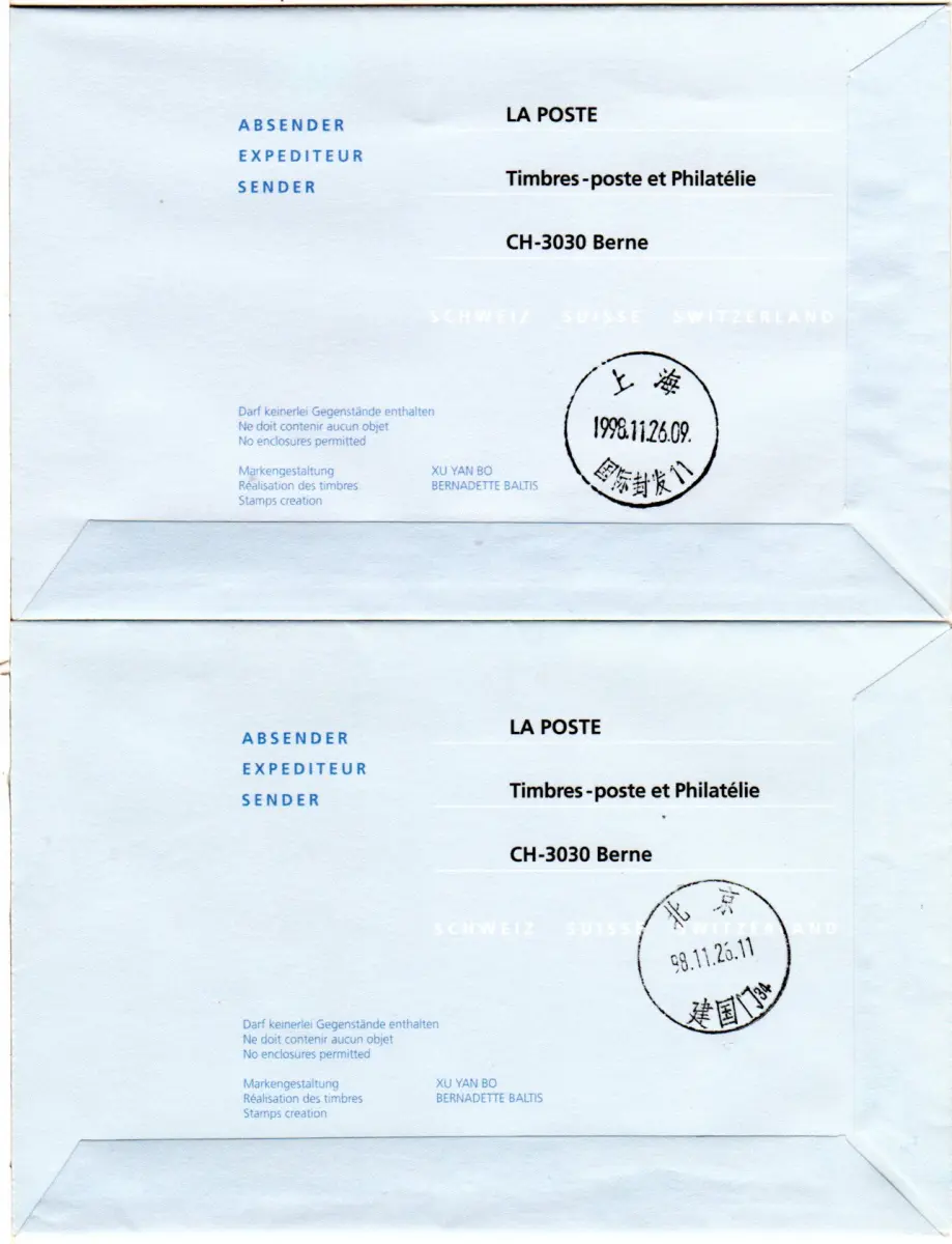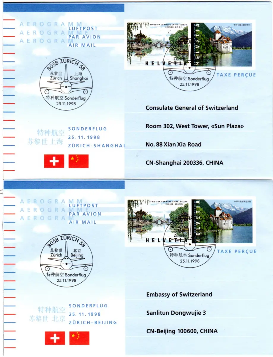 Schweiz 1998, 4 Aerogramme m. Sonderflügen n. Peking u. Shanghai,China