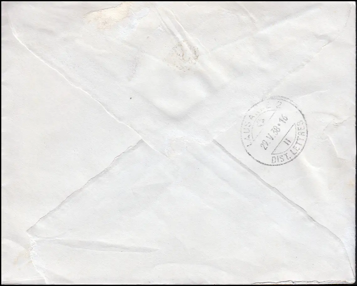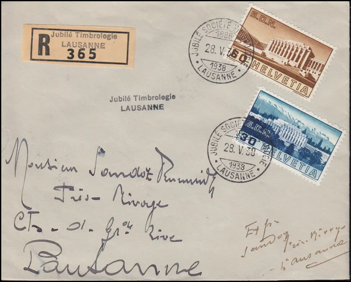 Sonder-Einschreibe-Zettel Jubile Timbrologie / Philateliejubiläum, passender Sonderstempel LAUSANNE Jubile Societe Trimbrologie 28.V.1938, Ankunftsstempel LAUSANNE DIST.LETTER 20.5.38