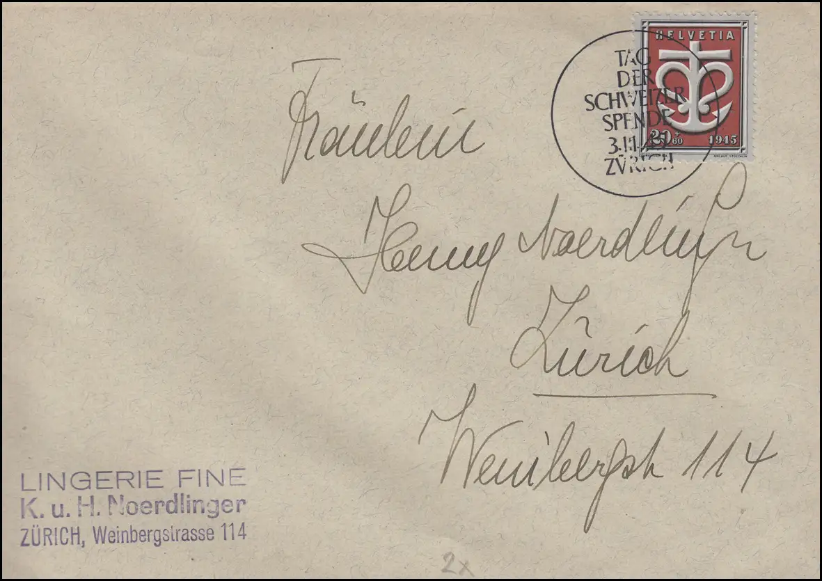 Schweiz 443 Spende an die Kriegsgeschädigten 20 C. EF Orts-Bf. SSt ZÜRICH 3.3.45