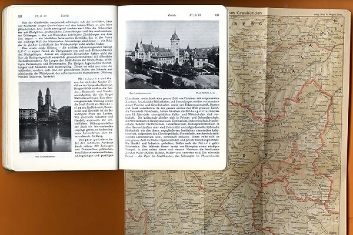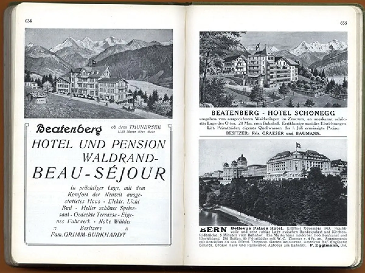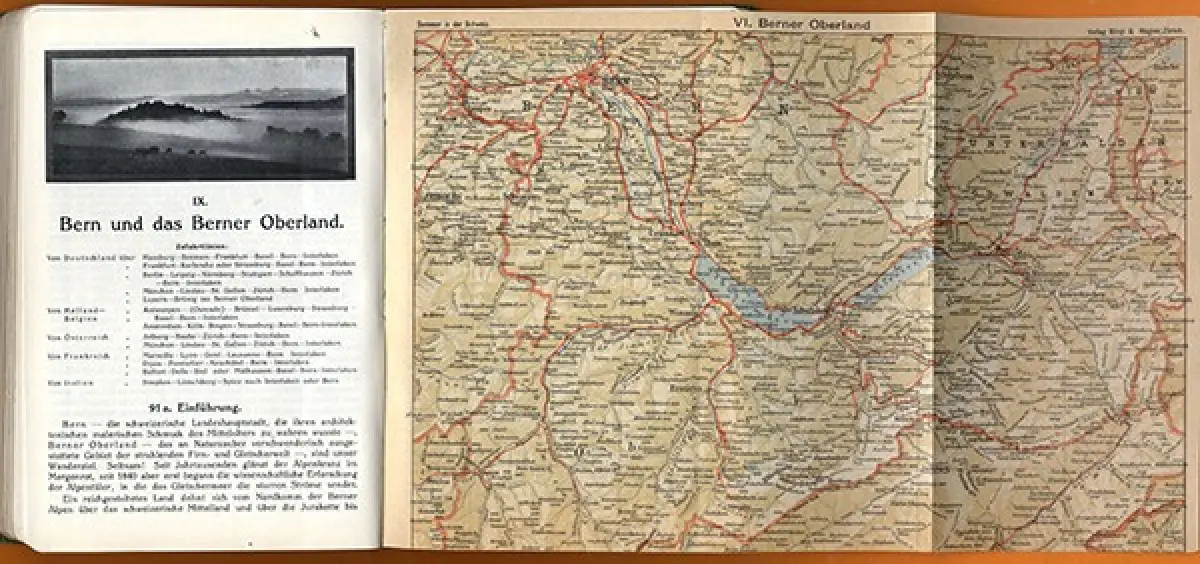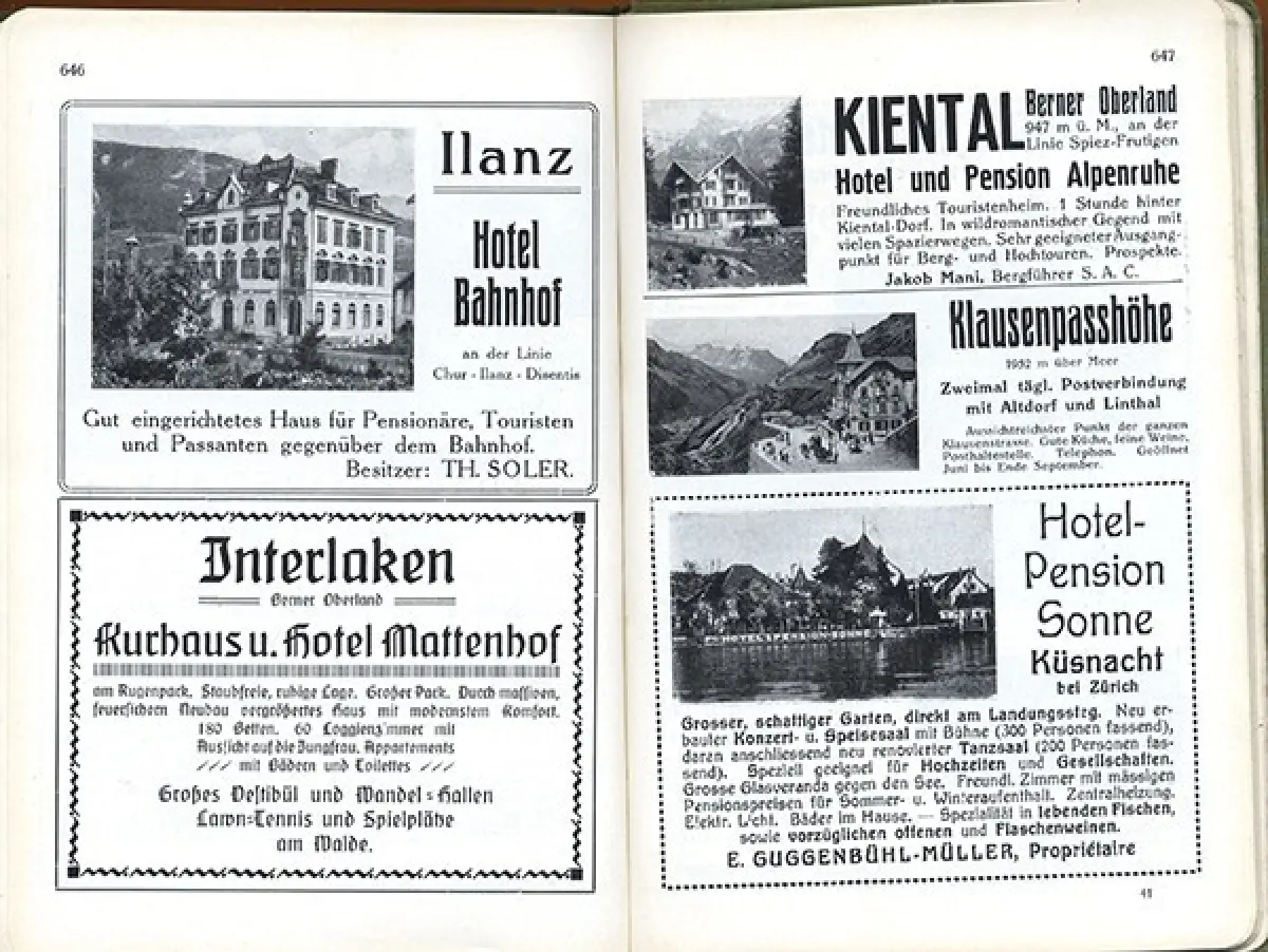 mit GESAMT 686 Seiten fotografischen und druckgraphischen Abbildungen Karten und Kunstbeilagen einem Verzeichnis der Schweizer Tennisplätze einem Ortsregister Eisenbahn Reise und Verkehrsverbindungen in dioe Schweiz der Sommer in der Schweiz die Schweiz und ihr eunterschiedlichen Regionen Verkehrs und Wanderbuch mit einer Kurzbeschreibung ca 1000 Orten und Ausflugszielen der gesamten Schweiz mit alphabetischen Verzeichnis der Hotels Pensionen Kuranstalten und Sanatorien dazu Anzeigen und Inserate Hotel und Gaststätten Werbung\nGuter Zustand Format 18cm x 12cm.\n Die ausgewählten Bildbeispiele haben eine unterschiedliche Auflösung was die Wiedergabe durch den Scan beeinträchtigen kann.