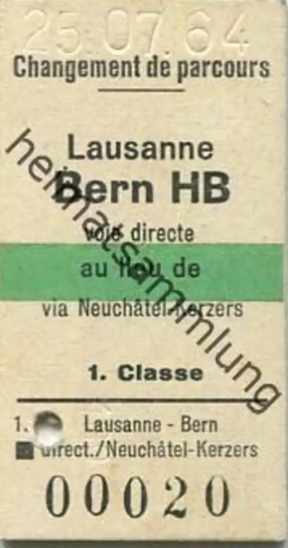 Schweiz - Changement de parcours 1964 - Lausanne Bern HB voie directe au lieu de via Neuchatel-Kerzers - Billet 1. Classe - rückseitig Klebepunkte (G55842)