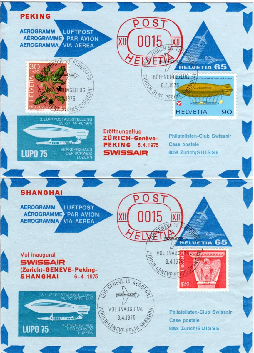 Schweiz-China 1975, 2 Swissair Erstflug Belege Zürich-/Genf-Peking-Shanghai