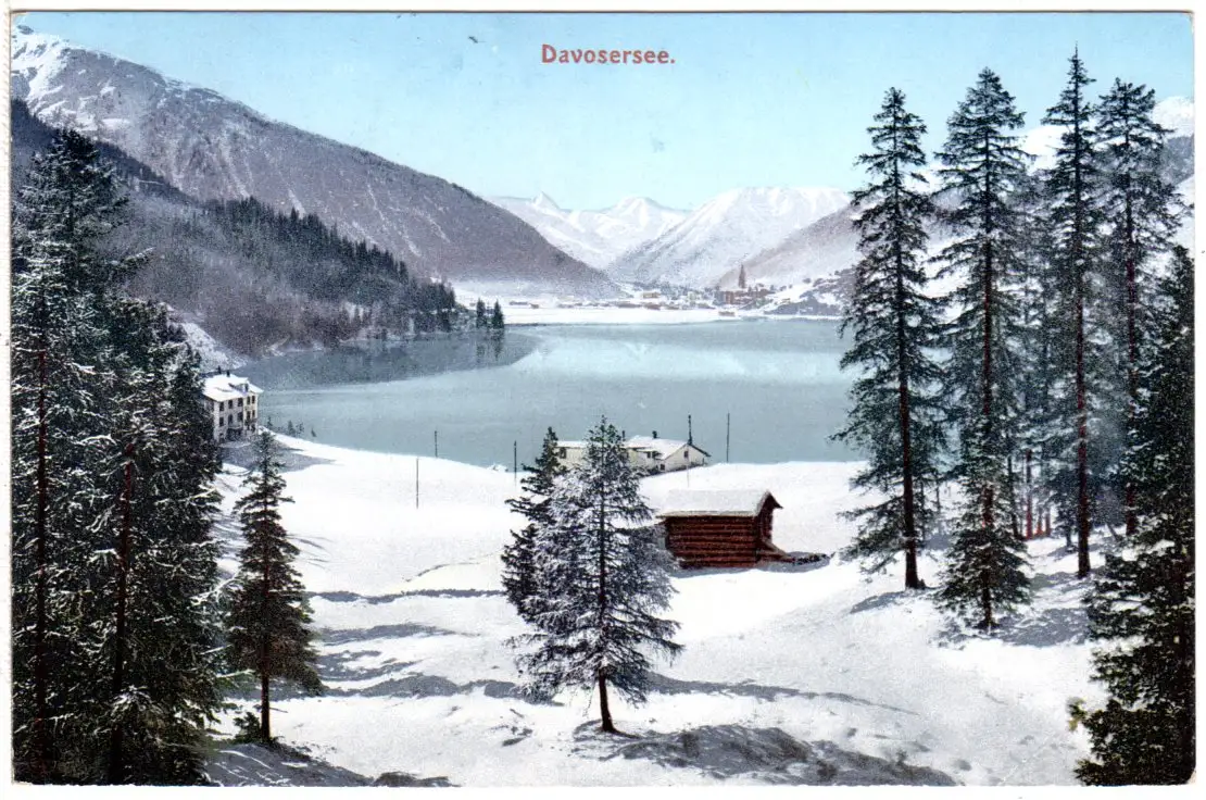 Schweiz, Davosersee, Winterkarte m. Gebäuden, 1908 gebr. Farb-AK