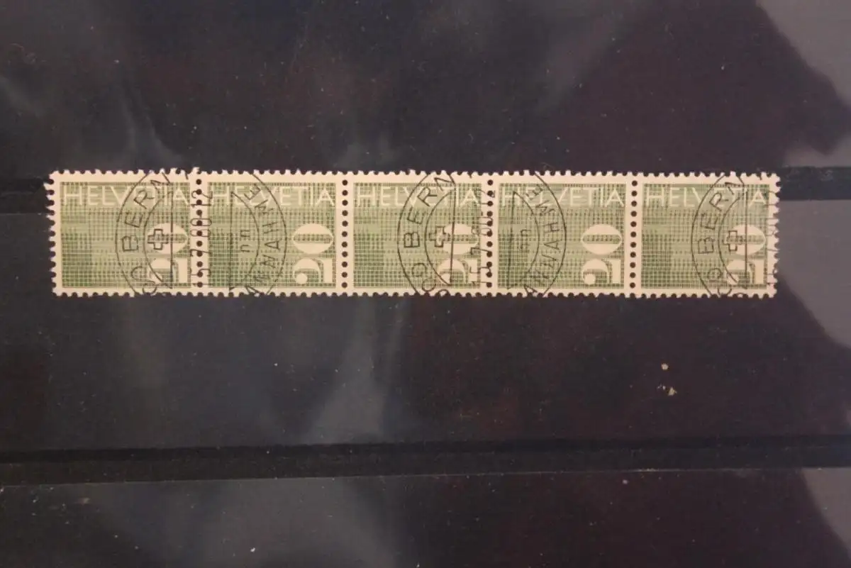 Schweiz, Freimarke: Ziffern; 5er Streifen, 20 Rp.; grüne Zähl-Nummer, Gestempelt