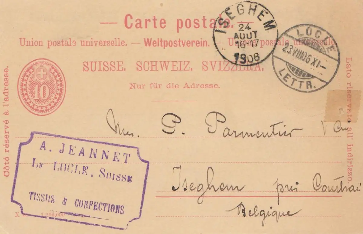 Schweiz: Ganzsache: 1906 Locle nach Isghem/Belgien