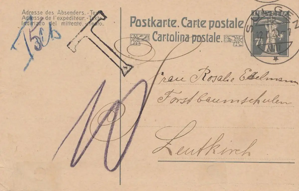Schweiz: Ganzsache: 1920: Sulgen nach Leutkirch, Nachgebühr
