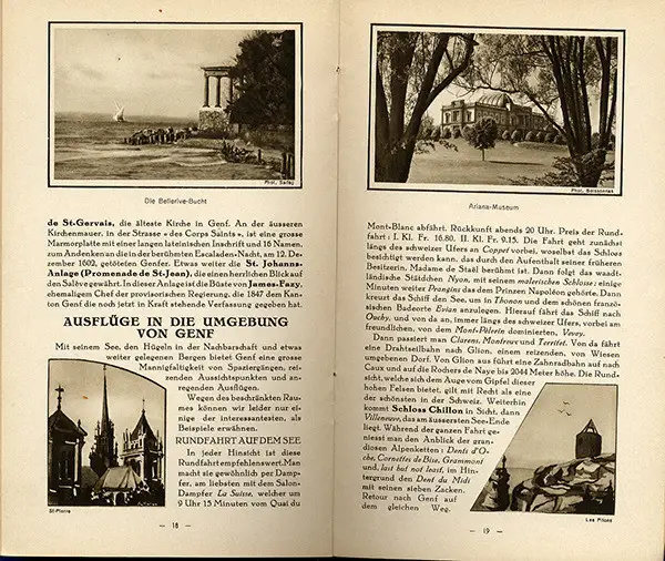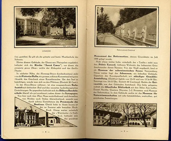 mit GESAMT 32 Seiten photographischen und kunstgraphischen Abbildungen einem farbigen Stadtplan Beschreibung der Stadt ihrer Geschichte Bauwerke und Sehenswürdigkeiten Brücken und Denkmäler Öffnungszeiten der Museen und Sammlungen die Schulen der Stadt Genf als Wohnort Ausflüge in die Umgebung Verzeichnis empfehlenswerter Geschäfte Verkehrs und Behördenübersicht Sport und Erholung