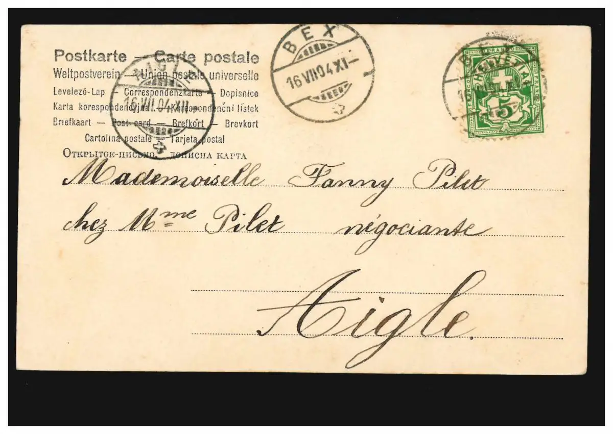 Schweiz Kinder-AK Mädchen mit blauer Kappe Korb, BEX 16.8.1904 nach AIGLE 16.6.