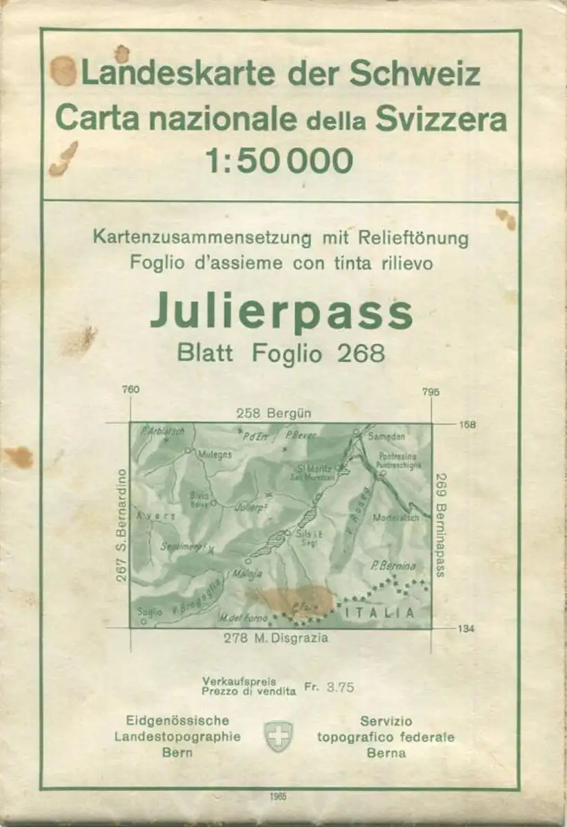 Schweiz - Landeskarte der Schweiz 1:50 000 - Julierpass Blatt 268 - Eidgenössische Landestopographie Bern 1965 - mit Relieftönung - Deckblatt fleckig (EP2011)