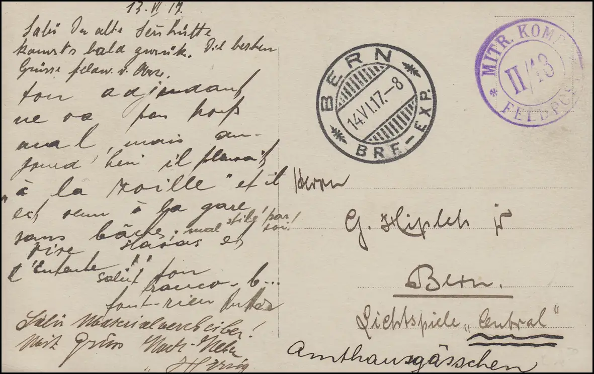 Schweiz MITR. KOMP. II/13 FELDPOST auf AK Militaria Pferde BERN 14.6.17 n. Bern