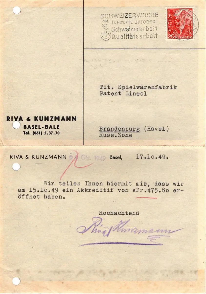 • MichSeite Schweiz: MiNr. 503, "Landschaften", Ganzstück (Faltkarte), echt gelaufen Beschreibung \nAusgabeland: Schweiz \nAusgabeanlass: Briefmarkenausgabe "Landschaften" Katalognummer: MiNr. 503 Ausgabedatum: 15.03.1948 Nominale: Wert zu 0,25 SFR \nTyp: - \nErhaltung: Ganzstück (Faltkarte), Werbeflagge "Schweizerwoche / Schweizerarbeit / Qualitätsarbeit", Firmenlochung \nHinweis: Versand aus Basel nach Brandenburg an der Havel (Sowjetische Besatzungszone) an die Lineol Spielwarenfabrik