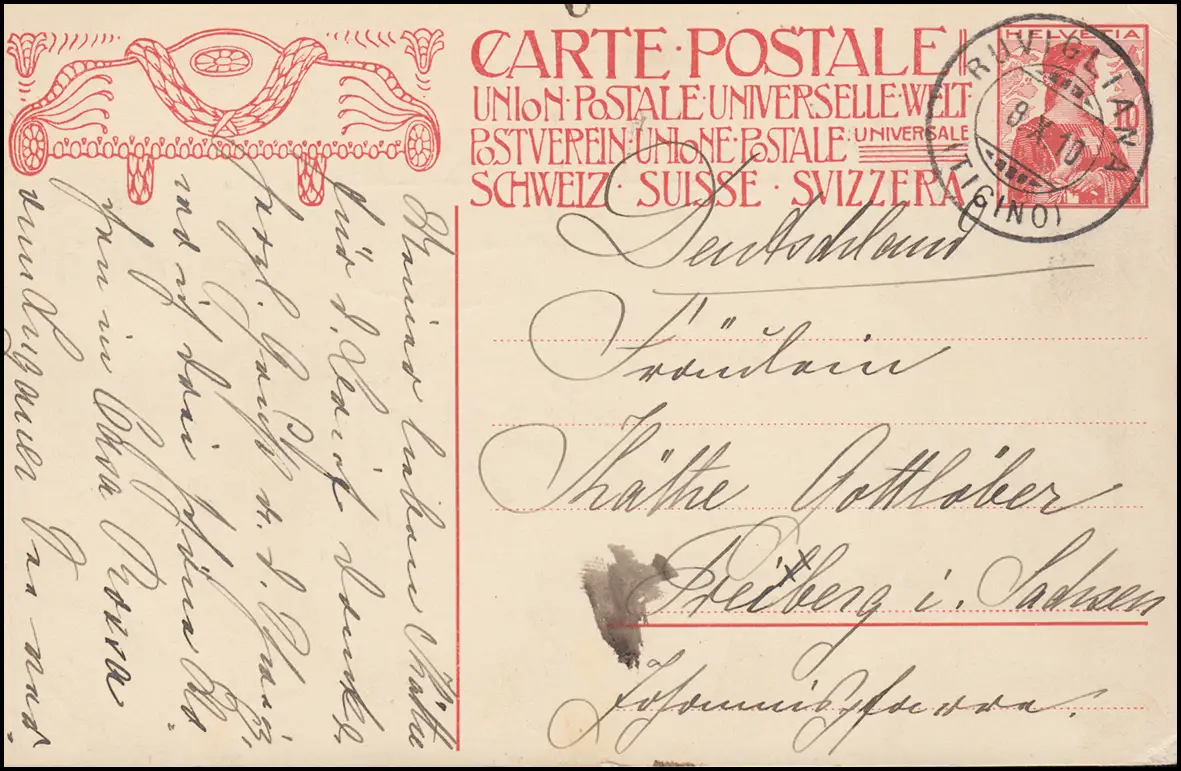 Schweiz Postkarte P 68a Weltpostdenkmal in Bern, RUVIGLIANA (TICINO) 8.10.1910
