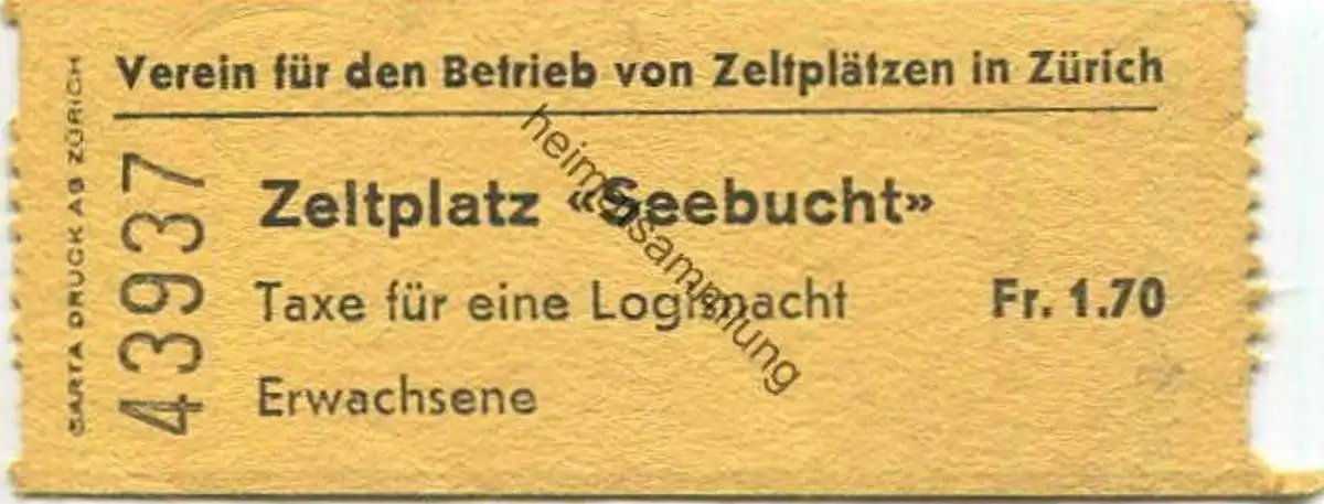 Schweiz - Zürich - Zeltplatz "Seebucht" - Taxe für eine Logisnacht - Erwachsene Fr. 1.70