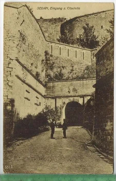 Sedan, Eingang zur Citadelle, Verlag: A. Richter Leipzig , FELD – Postkarte, unbenutzte Karte, Maße:14 x 9 cm. Erhaltung:I-II, Karten werden in Klarsichthülle verschickt.(H)