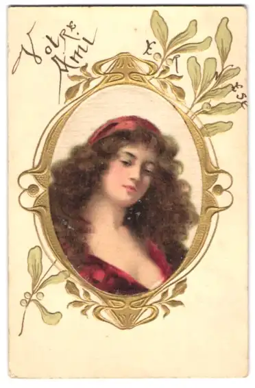 Seiden-AK Dame mit rotem Haarband gerahmt von Mistelzweig