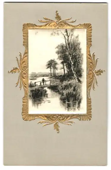 Seiden-AK Flusspartie mit einem Kind auf einer kleinen Holzbrücke, geprägtes goldenes Passepartout