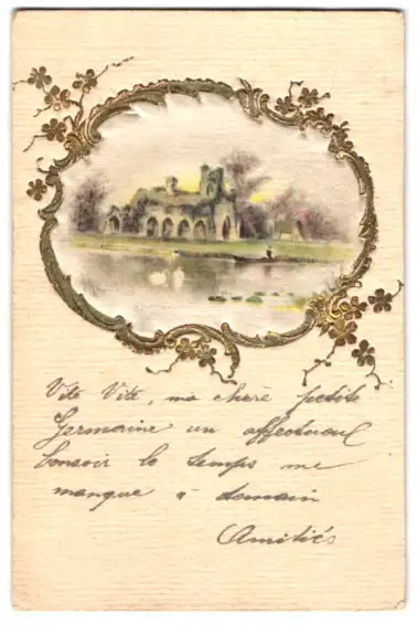 Seiden-AK Ruderer vor einer Burgruine, Blüten-Passepartout