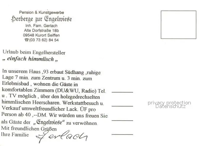 Seiffen_Erzgebirge Pension und Kunstgewerbe Herberge zur Engelwiese Fremdenzimmer Seiffen Erzgebirge postalisch nicht gelaufen nach 1965 Erhaltung siehe scans [FriedD77] Frierer