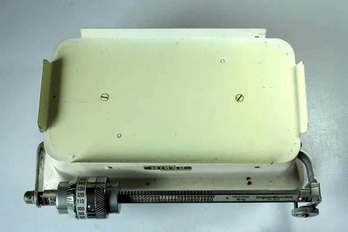 Rarität - Seltene kleine alte Küchenwaage Original Mikro Döft, 10 kg, creme-weiß, Metall, Sammlerstück aus den 1950ern, kleine Haushaltswaage - voll funktionsfähig, Backwaage, ideal als Geschenk, Retro Küche, die Schale kann platzsparend umgedreht werden - guter Vintage Zustand mit minimalen altersbedingten Gebrauchsspuren - die Waage kann bis zu 10 kg Gewicht aufnehmen !!