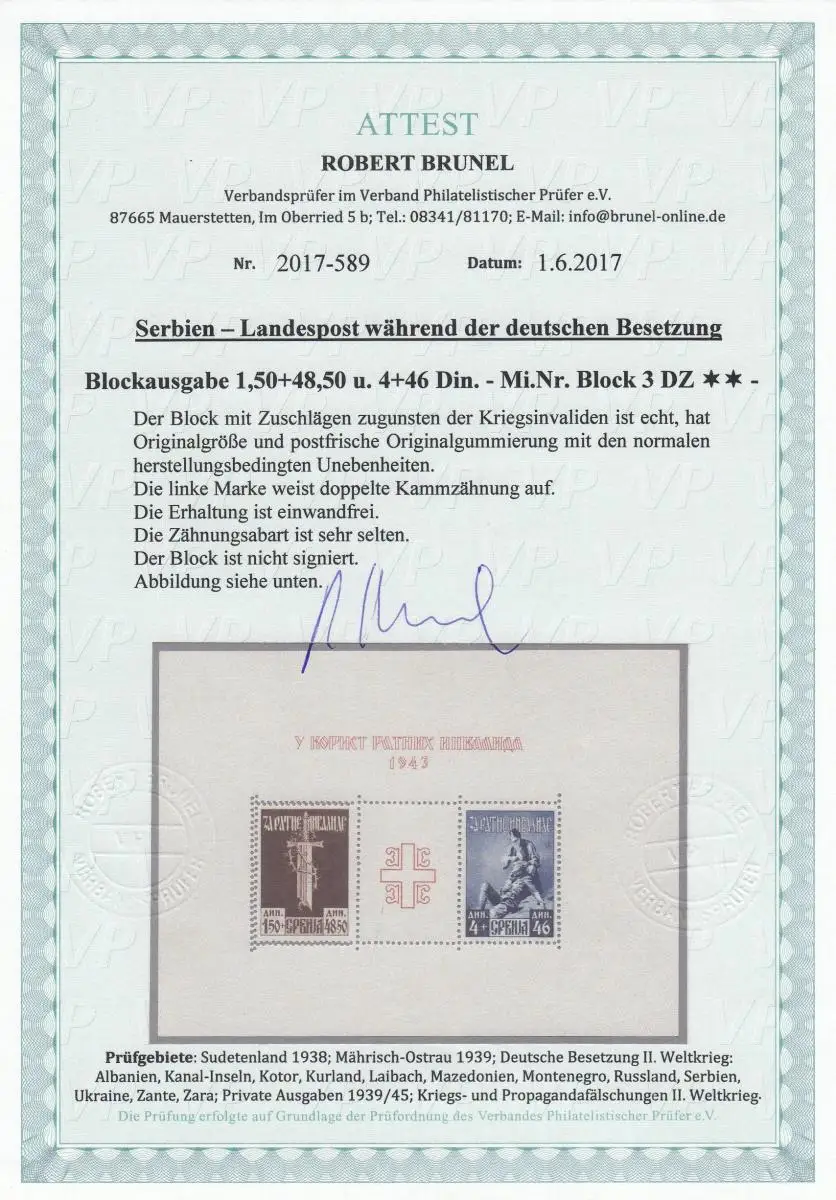 Serbien: Block Nr. 3 DZ, postfrisch, doppelte Kammzähnung