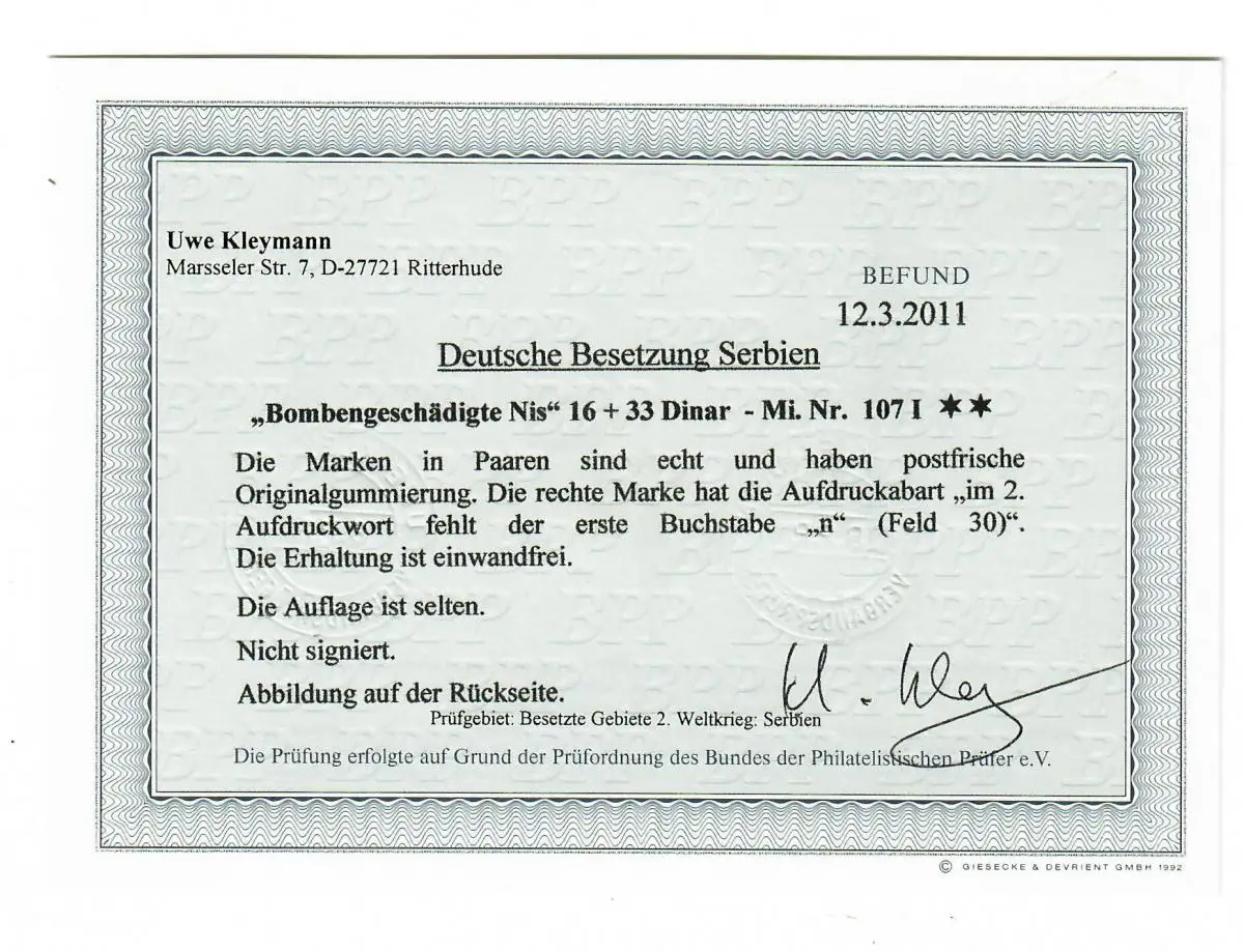 Serbien MiNr. 107 I, postfrisch, ** waagr. Paar mit Plattenfehler, BPP Befund