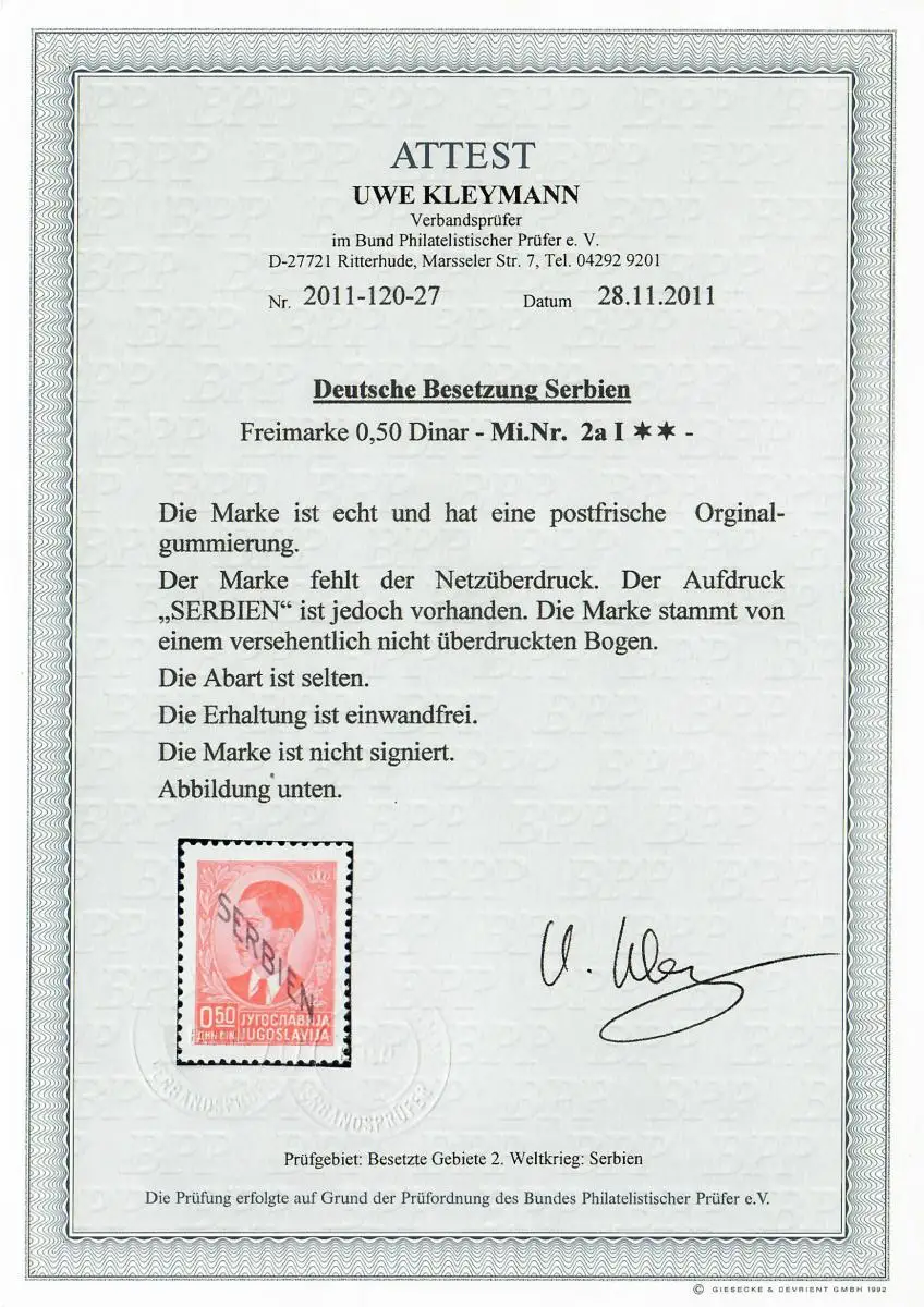 Serbien MiNr. 2a I, seltene Abart, postfrisch,** BPP Attest