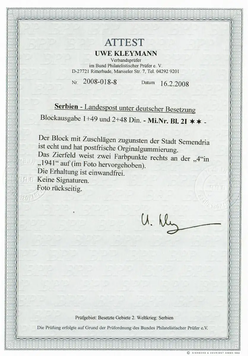 Serbien MiNr. Block 2 I, postfrisch, ** BPP Attest, für die Stadt Semendria