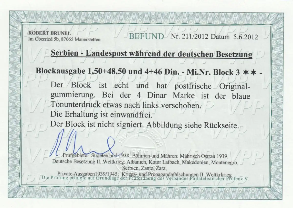 Serbien MiNr. Block 3, postfrisch, **, BPP Befund