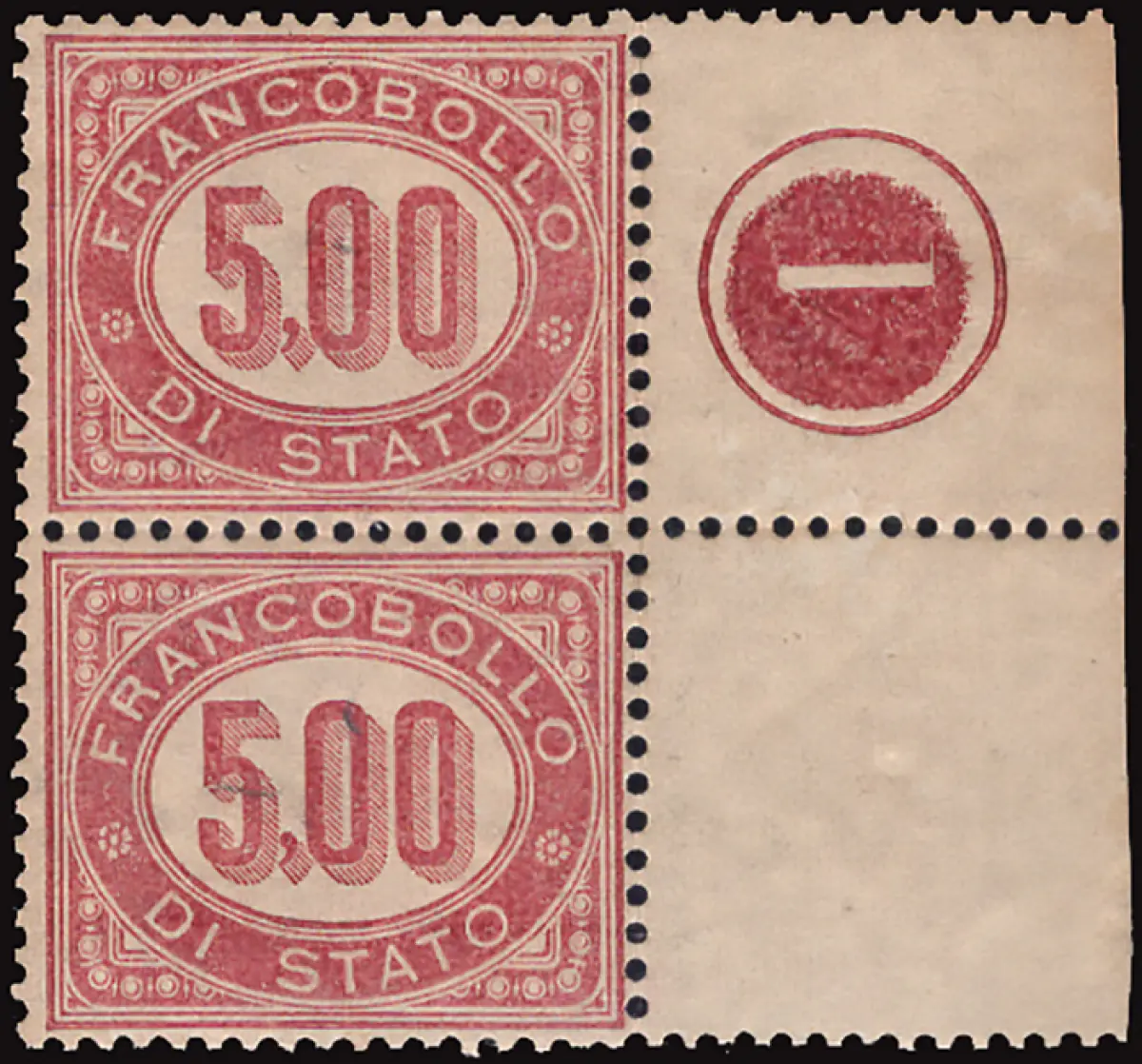 MNH - Vollgummi - - Service Lire 5 Nr. 7 vertikales Paar b. von f. mit Tischnummer 1 im Kreis im oberen Exemplar - Sehr gute Qualität und Zentrierung - Selten - Kat. euro 6.800++ Cod.75/182