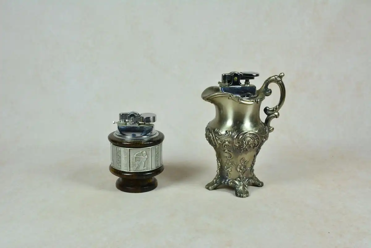 Set aus 2 einzigartigen Zinn-Tischfeuerzeugen