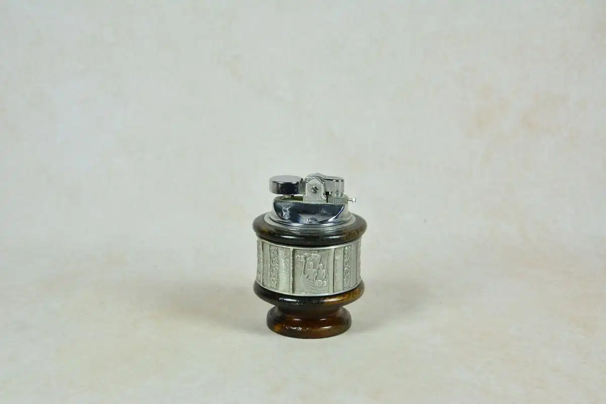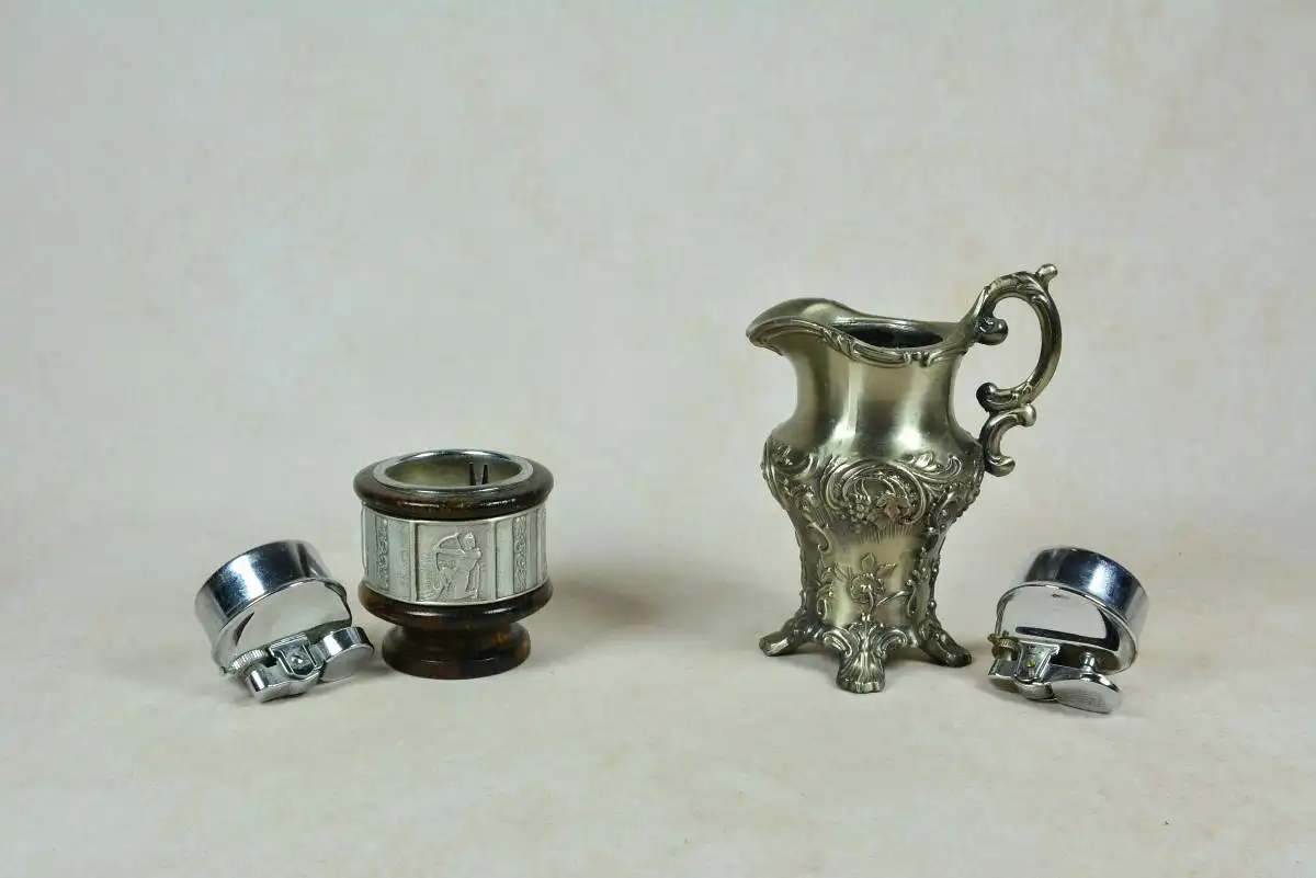 Dieses Set umfasst zwei einzigartige Zinn-Tischfeuerzeuge: ein 7,5 cm hohes Feuerzeug mit Holz- und Zinn-Wikinger-Motiv und ein 12 cm hohes Feuerzeug in Form eines Milchkrugs mit einem Loch. Beide sind ungetestet, das Wikinger-Feuerzeug in sehr gutem Zustand, das Milchkrug-Feuerzeug in befriedigendem Zustand mit Beschädigungen. Ideal für Sammler oder Liebhaber von Wikinger-Dekor als einzigartige dekorative Akzente oder Sammlerstücke.