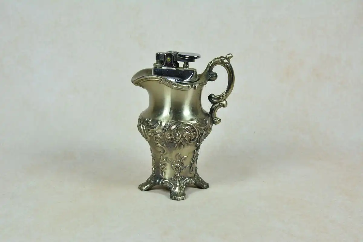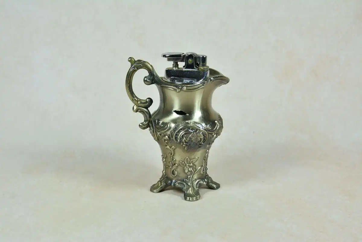 Tischfeuerzeug, vintage, Zinn, Wikinger-Motiv, Milchkrug, 1960er Jahre, Sammlerstück