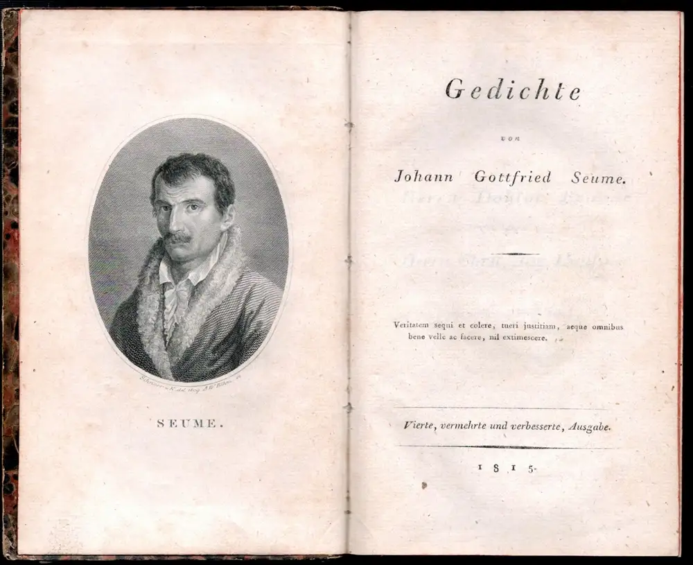 Alter Besitzvermerk "Passow, 1819" auf dem Vorblatt; darunter 14-zeiliges Glückwunschgedicht (Sonett) von derselben Hand, für "Gustav Haacke, den 25. April 1820" = wohl Karl [Friedrich] Passow (1798-1860), der in Breslau studierte und Mitstifter der Alten Breslauer Burschenschaft Arminia war, deren Vorsteher der am 25.4.1800 (siehe Widmung) in Breslau geb. Theologiestud. u. Mitburschenschaftler Gustav [Adolph] Haacke in seinem 20. Lebensjahr wurde . - Zur Gedichtausgabe siehe Goed. V 419, 8 (dort mit abweichender Kollation). - Mit Vorreden Seumes zu allen drei (zu seinen Lebzeiten erschienenen) Ausgaben seiner Gedichte. Christian August Heinrich Clodius (1772-1836) gab postum die 4. Auflage heraus, versah sie mit meist sehr ausführlichen Anmerkungen, ergänzte sie um zahlreiche, von ihm "politischen Inhalts" genannte Gedichte und verfasste ein Vorwort dazu. - Johann Gottfried Seume (1763-1810), demokratisch-patriotischer, antiklerikaler Schriftsteller, bekannt vor allem durch seinen "Spaziergang nach Syrakus". - Einband beschabt u. bestoßen, innen leicht gebräunt, sonst gut