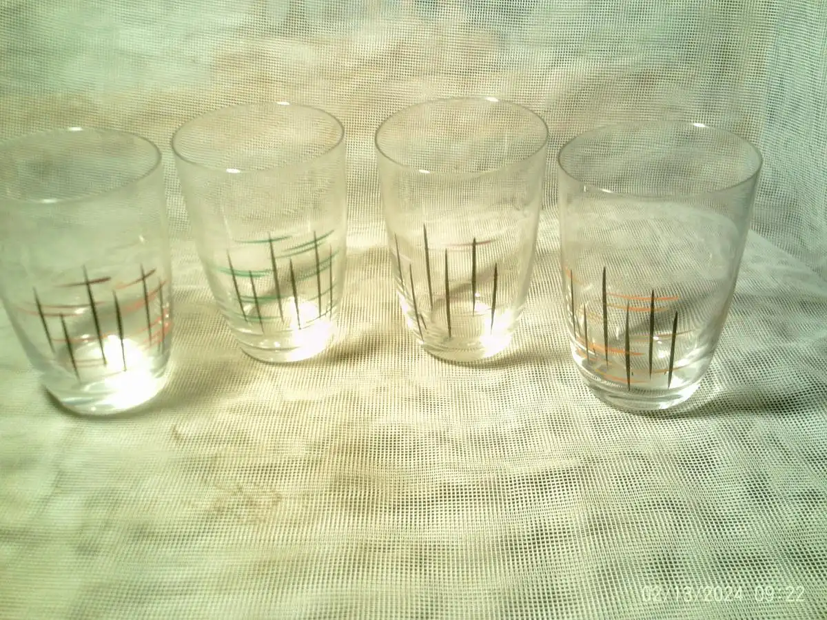 Sgraffito Dekor 50 Jahre von Hand bemalt 4 Saftgläser au der Vitrine H: 8,5 cm