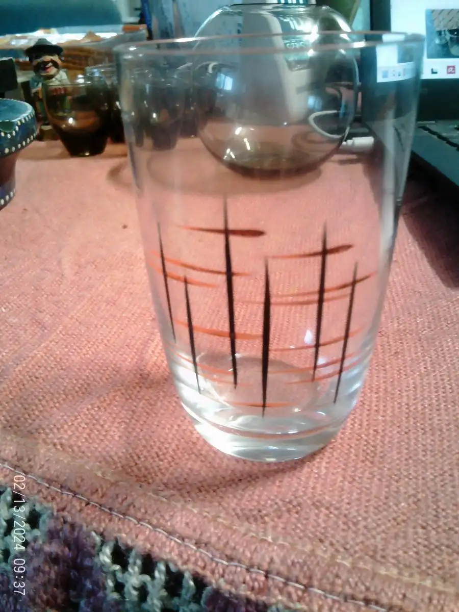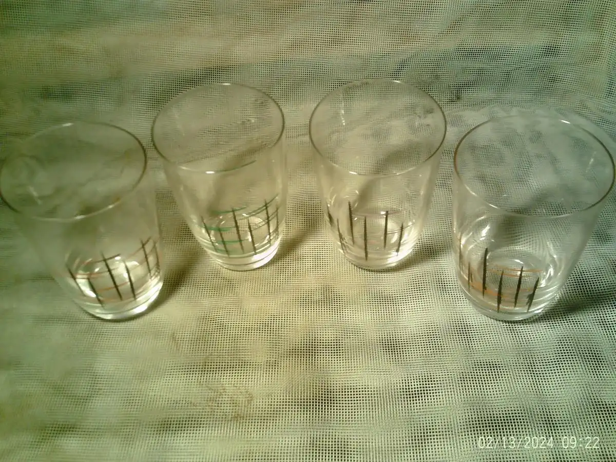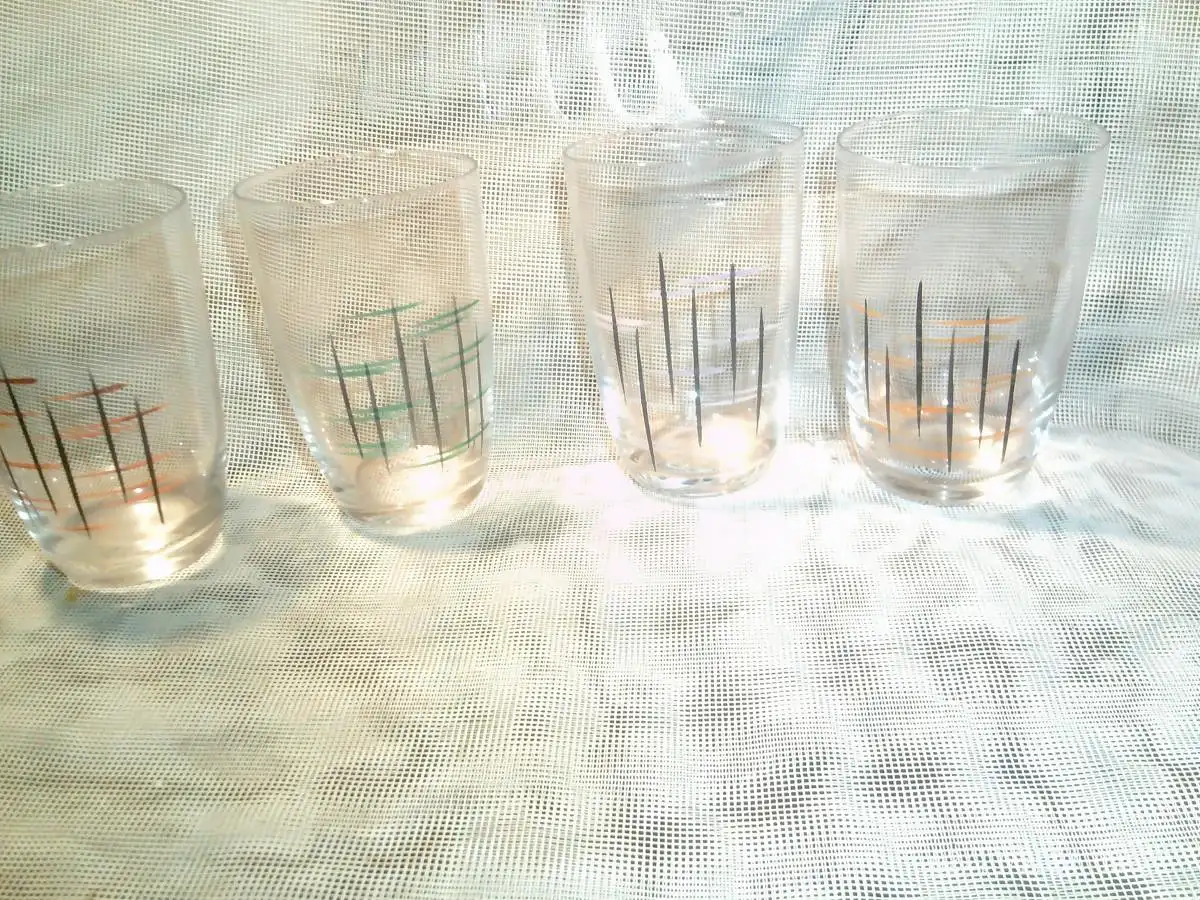Sgraffito Dekor 50 Jahre von Hand bemalt 4 Saftgläser au der Vitrine