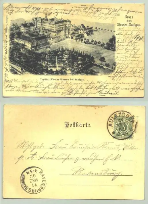 Artikelbeschreibung u. Zustand : Siehe Scan. Weitere Infos : Ansichtskarte. Gruss aus Siessen-Saulgau. PLZ-Bereich pauschal 88348. Postalisch gelaufen 1902