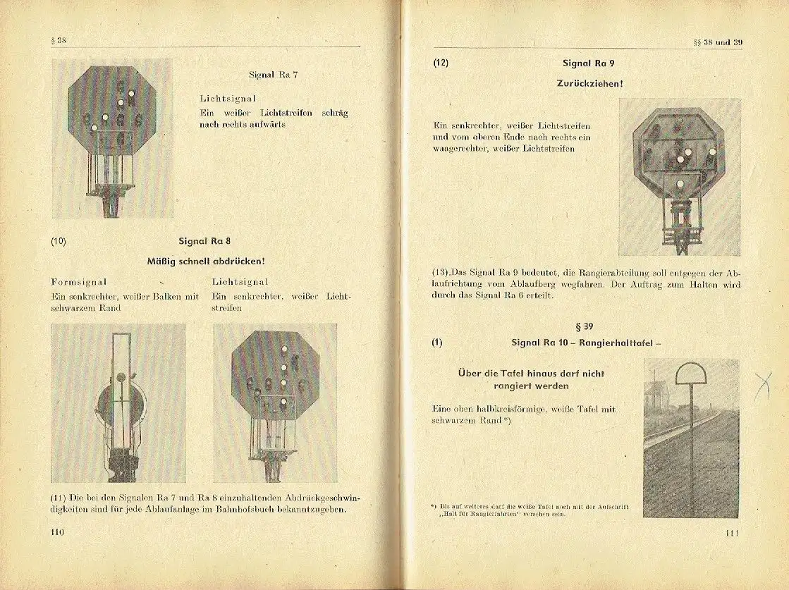 guter Zustand, geringe Gebrauchs- und Alterungsspuren: Papier vergilbt, aber Seiten überwiegend sauber und ordentlich, zahlreiche Seiten mit kleinen Markierungen (Kuli), Allgemeine Bestimmungen für die Signale - Formhauptsignale - Formvorsignale - Lichthaupt- und Lichtvorsignale - Lichtsignale der Berliner S-Bahn - Zusatzsignale an Hauptsignalen - Gleissperrsignal - Zusätzliche Signale bei elektrischer Zugförderung - Signale für Schiebelokomotiven und Sperrfahrten - Langsamfahrsignale - Schutzhaltsignale - Signale für das Zugpersonal - Aufforderungssignale zum Pfeifen und Läuten - Signale für den Rangierdienst - Weichensignale - Signale an Zügen und Nebenfahrzeugen - Signale an einzelnen Fahrzeugen - Läutesignale - Rottenwarnsignale - Sonstige Signale - Abweichende Signale - Anlagen, Leinen, ca. 15 x 21, 174 Seiten mit zahlreichen Bildern