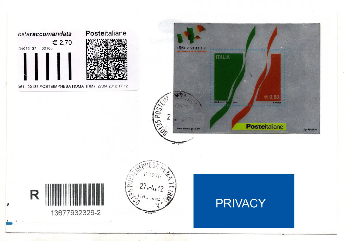 Umschlag - Tricolor aus gebrauchter Silberfolie auf Einschreiben zum perfekten Preis (damals 3,30 Euro) mit PT Label Integration. Postdokument, das die Anerkennung dieser Sonderausgabe als Amtsmarke belegt - Seltene Nr. 233/WEB