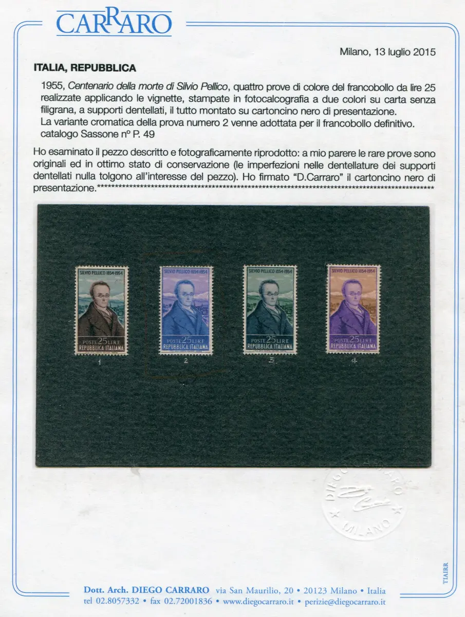 1955 - Hundertjähriger Todestag von Silvio Pellico - Vier Druckproben im zweifarbigen ungezahnten Fotokaldruck auf gezackten Untergründen auf schwarzem Karton montiert - Für die offizielle Ausgabe wurde der Test Nr. 2 genehmigt - Sehr selten und wohl einzigartig Für Fach- und Themenfachleute - Sächsischer Katalog Spec. Nr. P49 Bewertung Euro 5.000,00 - Zertifikat Carraro Cod. 398/WEB