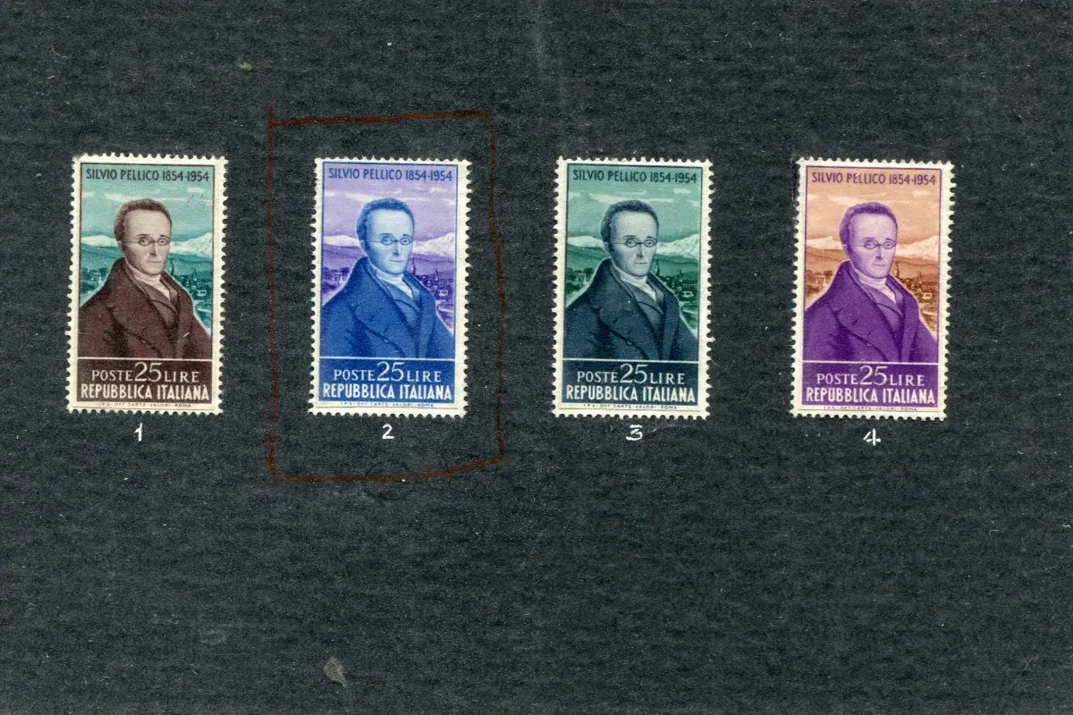 1955 - Hundertjähriger Todestag von Silvio Pellico - Vier Druckproben im zweifarbigen ungezahnten Fotokaldruck auf gezackten Untergründen auf schwarzem Karton montiert - Für die offizielle Ausgabe wurde der Test Nr. 2 genehmigt - Sehr selten und wohl einzigartig Für Fach- und Themenfachleute - Sächsischer Katalog Spec. Nr. P49 Bewertung Euro 5.000,00 - Zertifikat Carraro Cod. 398/WEB