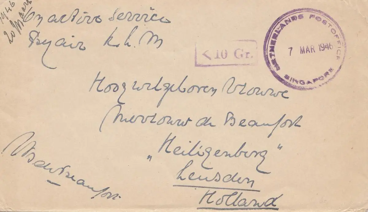 Singapore: 1946: Nederlands post office - 10 Gr. to Heiligenberg/Leusden/Holland