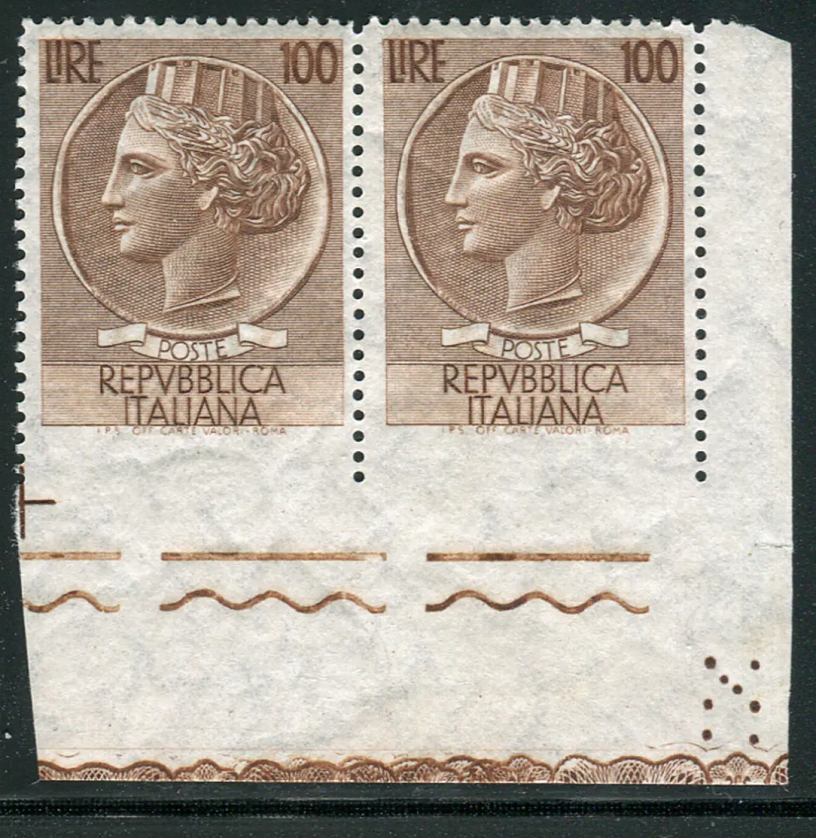 Siracusana Lire 100 stelle II dent. 13,1/4 nicht gezahnt. Unten Vollgummi MNH - Syrakus Lire 100 Sterne II (65. Rechts) Verzahnung 13,1/4 Nr. 785/Ic Paar a. von f. unten ungezähnt - unten Ecke N gepunktet - Schön und ungewöhnlich - Kat. 1.200+ Cod. 643/13